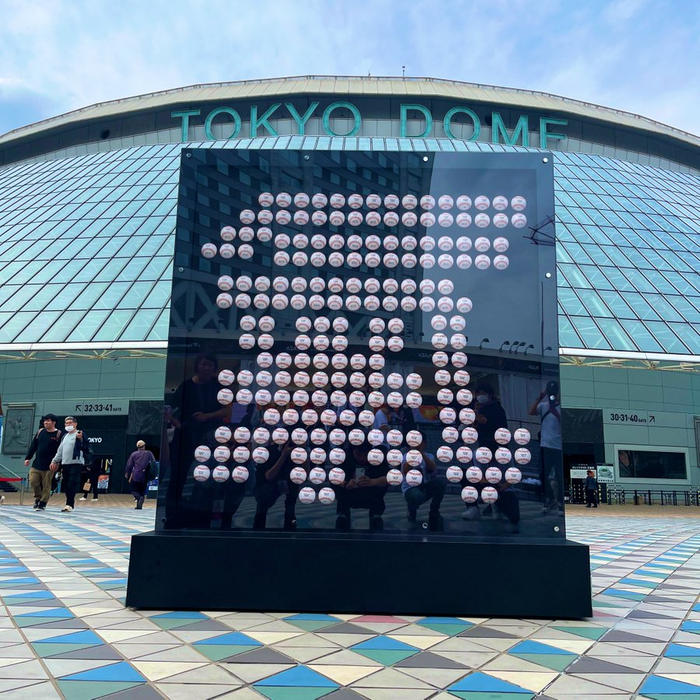 (※写真は読売巨人軍の「X」より) - 2025年3月から東京ドーム22ゲート前広場では、高さ200cmの「氣」モニュメントを展示していました。田中投手のグラブに刺しゅうされている「氣持ち」の一文字を、200個のボールで表現したものです。ボールには勝利数と、勝利した日付、当時の所属球団で背負った番号が印字されています。田中投手が勝利するたびに追加し、200勝を達成して完成しました。