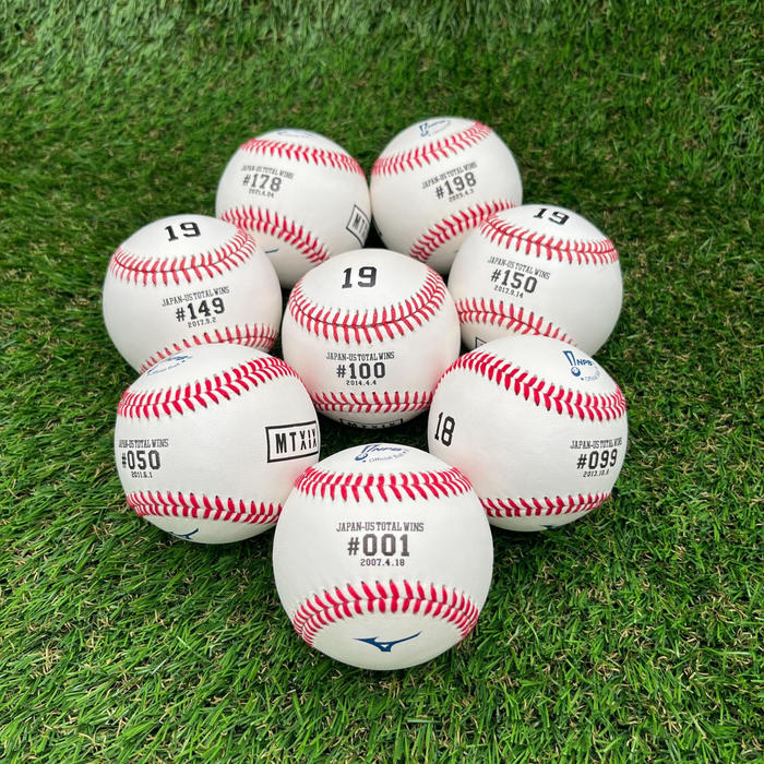 - 勝利ナンバーごとにボールのデザインが異なります。勝利したときに所属していた球団にあわせて、東北楽天ゴールデンイーグルス、読売ジャイアンツでの勝利記念ボールは、NPBの公式球。ニューヨーク・ヤンキースでの勝利記念ボールは、MLB公式球です