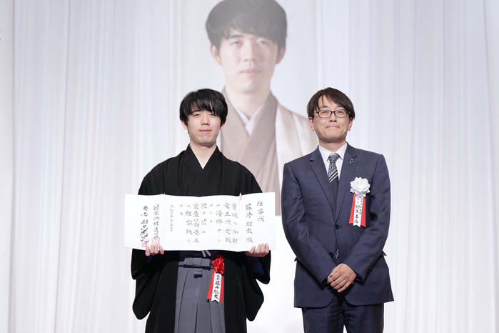 - (2025年1月に行われた竜王就位式で推挙状を受け取った藤井竜王と羽生前会長)